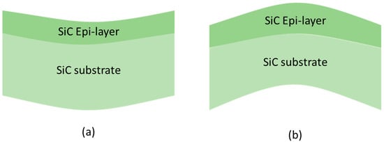 Thicker epitaxial layers are especially desirable for high-voltage applications. For example, a 1 µm epitaxial layer on a SiC Schottky diode can support a breakdown voltage of approximately 118 V [6]. Consequently, to meet the stringent requirements of high-voltage device design, epitaxial layers typically need to be tens to hundreds of micrometers thick. To support such thick growth, the preparation of high-quality, low-defect substrates is essential. The chemical mechanical planarization (CMP) process is widely adopted in substrate fabrication to achieve the surface planarity and defect control required for epitaxy. However, CMP can introduce surface scratches and residual stress, which may impact the morphology and defect density of the subsequently grown epitaxial layers [7,8,9]. Wafer geometry characteristics, such as bow, warp, and total thickness variation (TTV), further complicate this integration, especially as epitaxial thickness increases [10,11,12].