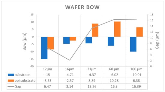 The schematic in Figure 2 shows the wafer bowing phenomenon and Figure 3 illustrates the wafer bowing behavior from the substrate (blue bar) to different epitaxial layer thicknesses (orange bar). The gap between the substrate and the epitaxial wafer was calculated and plotted in the figures using a line chart (secondary axis). We observed that all the as-polished wafers were negative bowing, indicate a tensile stress distributed with Si-face toward up. But it shifts toward the positive when a 12 μm SiC epitaxial layer growth on the wafer, with a significant increase occurring when the epitaxial layer thickness exceeds 31 μm. Nadeemullah A. Mahadik et al. has reported wafer shape change may come from lattice plane curvature, and it can arise from doping variation, thermal stress, and extended defect concentrations [16]. Meanwhile, Fumihiro Fujie et al. found wafer warp increased with thicker epi layer growth and the influence of the difference in the lattice constants caused by the difference in nitrogen concentrations between the n− epilayer and the n+ substrate; the stress distribution was calculated by finite element method [8]. In this section, our research work regarding wafer bowing phenomenon has positive correlation with the previous research work. From the observation, it is essential to further study stress compensation by increasing substrate thickness or generate more tensile stress during substrate wafering process.