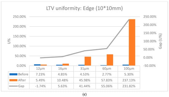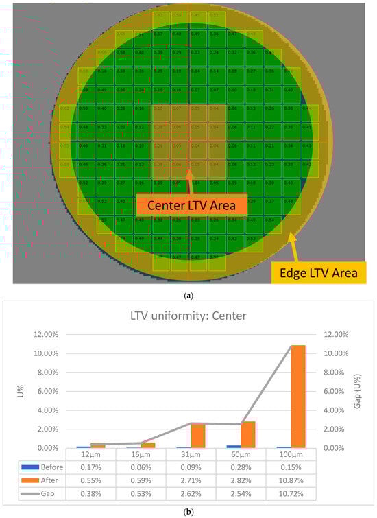 To further understand the wafer LTV behavior at each epitaxial layer thickness, we calculated the uniformity variation in the wafer center area and edge area separately, as shown in Figure 5a. The formulation for LTV uniformity is shown in Equation (1):
