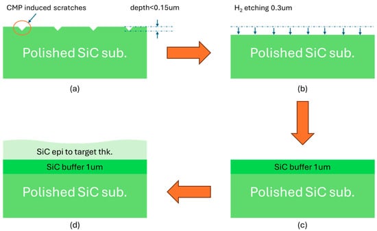 Schematic of CMP induced scratch removal in the epitaxial process steps (a) as-polished SiC wafer and (b) surface etching by H2 treatment in the process step 2 (c) 1μm buffer layer growth and in the process step 3 (d) epi layer growth to the target thickness.