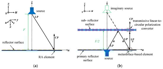 Figure 1 shows the architecture of the proposed CPFRA, which is composed of three parts: a linearly polarized feed radiator, a primary reflector surface, and a sub-reflector surface. Here, the u-direction indicates the direction within the xoy plane that forms a −45° angle with the positive direction of the x-axis, and the v-direction indicates the direction within the xoy plane that forms a 45° angle with the positive direction of the x-axis.