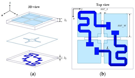 In order to realize the architecture proposed in Section 2.1, a metasurface-based element on the primary reflector surface is designed. Figure 3a shows a 3D view of the proposed element. The metasurface-based element is composed of two dielectric layers and three metal layers. The top layer is a 2 × 2 square patch, the middle layer is a metal ground layer with a cross-shaped slot, and the bottom layer is a microstrip line layer. The dielectric substrate of the metasurface-based element is made of Rogers Duroid 4003 material (with εr = 3.55 and tanδ = 0.0027 at 10 GHz). The thicknesses of the upper substrate and the lower substrate are 0.508 mm and 0.254 mm, respectively. Figure 3b shows the top view of the metasurface-based element. The length of the side of the element is 5.8 mm. The length of the square patch is sur_w = 2.2 mm. The distance between two adjacent patches is sur_s = 0.3 mm. Because of the introduction of the metasurface, broadband performance can be achieved. In addition, a reflective phase of more than 360° can be adjusted by changing the length of the microstrip line (L). The detailed working principle and design steps can be found in [].