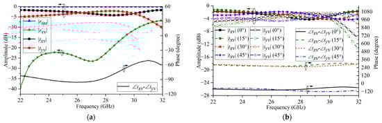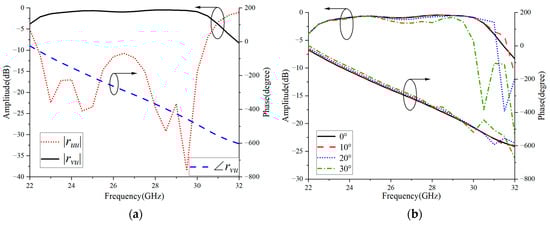 The simulated reflective and transmissive results are shown in Figure 8a. The symbol |rvv| represents the reflection coefficient of the linearly polarized incident wave along the v-polarization direction. |tyv| indicates the amplitude of the transmitted wave along the y-axis component when the incident wave is linearly polarized along the v-polarization direction. |txv| represents the amplitude of the transmitted wave along the x-axis component when the incident wave is linearly polarized along the v-polarization direction. The simulation results show that when the incident wave is incident perpendicularly, the linearly polarized EW in the x-direction is reflected back and cannot pass through the polarization converter. The linearly polarized incident waves along the y-axis direction can pass through this polarization converter, and within the frequency band of 23–29 GHz, the amplitudes of the two orthogonal components of the transmitted waves are approximately equal, and the phase difference is −90° ± 15°. Figure 8b shows the transmission amplitude and phase difference responses of the linear-to-circular polarization converter under the oblique incidence condition. The results indicate that the proposed transmissive linear-to-circular polarization converter still has good polarization conversion performance under oblique incidence and is suitable for the design of broadband low-profile circularly polarized RAs.