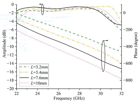 The metasurface-based element achieves 360° reflection phase compensation by changing the length (L) of the microstrip lines. Figure 5 shows the result of phase compensation. When changing the length of the microstrip lines from 3.2 mm to 10 mm, the values of the reflective amplitude are more than −2 dB. Moreover, more than a 360° phase range can also be obtained. The simulation results show that the element has good performance.