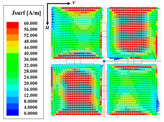 Surface current distribution of a 2 × 2 patch layer based on metasurface-based element.