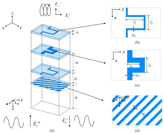 Based on the architecture proposed in Section 2.1, the sub-reflector surface needs to have the functions of converting LP to CP and polarization selection. Inspired by the linearly polarized grids and the transmission-type circularly polarized mender lines, a transmissive linear-to-circular polarization converter based on polarized grids and mender lines is proposed as the sub-reflector surface element. The geometry is shown in Figure 7. As shown in Figure 7a, represents the electric field of the transmitted EW along the y-polarization direction, represents the electric field of the transmitted EW along the x-polarization direction, represents the electric field of the incident EW in the v-polarization direction, and represents the electric field of the reflective EW in the u-polarization direction. The polarization converter is composed of a four-layer dielectric substrate, which is made of Rogers Duroid 4350 material with the same thickness h. Under each layer of dielectric substrate layer is an air layer. The thicknesses of the air layers are d1, d2, and d3. Each layer of the dielectric substrate is covered with metal on the bottom and without metal on the top. The top metal layer to the third metal layer are mender lines, and the top and third mender lines are the same. The top and second metal layers are displayed in Figure 7b,c. Figure 7d shows the bottom metal layer, which is composed of polarized grids. The detailed parameter values of the transmissive linear-to-circular polarization converter are listed in Table 1.