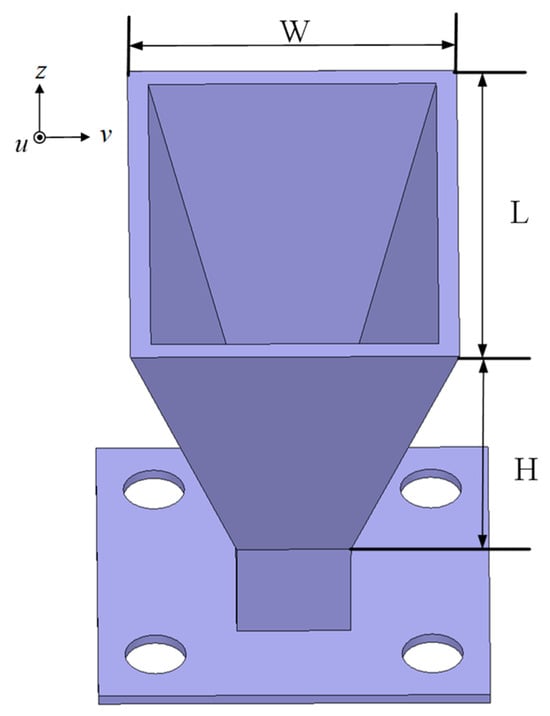 In this design, the LP cone horn antenna as shown in Figure 9 is adopted as the feed source of the reflectarray antenna. The proposed LP horn antenna operates within the frequency band of 22–36 GHz. Therefore, a WR34 standard rectangular waveguide is connected to the cone speaker, and then a 2.92 mm coaxial adapter is used to convert the WR34 standard rectangular waveguide to achieve the connection between the horn antenna and the final test equipment. In order to facilitate physical testing, a flange plate is designed for the assembly of the test. Its dimensions are L = 20 mm, W = 14 mm, and H = 17 mm.