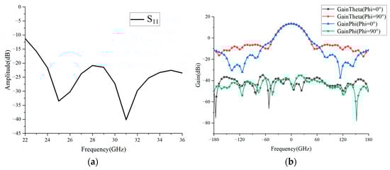 Figure 10a shows the reflection coefficient of the LP horn antenna. It can be seen that within the frequency band range of 22–36 GHz, the reflection coefficient is always less than −10 dB. Figure 10b is the normalized radiation pattern of the speaker at a center frequency of 26 GHz. It can be seen that its peak gain is 13.5 dBi and the cross-polarization is less than −50 dB. If the −10 dB lobe width of this speaker is 64°, then the opposite half-angle is 32°.