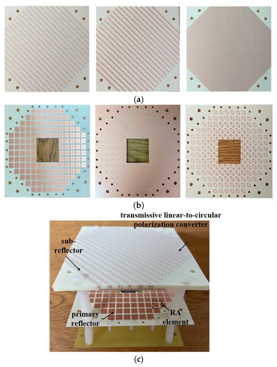 The primary reflector surface and the sub-reflector surface were fabricated using the standard printed circuit board (PCB) process. The fabricated parts of the CPFRA are shown in Figure 11. Figure 11a is a photo of the transmissive linear-to-circular converter, which consists of the sub-reflector, and Figure 11b is a photo of the metasurface-based element, which consists of the primary reflector. The LP horn antenna was fabricated with metal materials. To assemble the FRA with the linearly polarized horn antenna, a substrate, several nylon struts, and screws were used, as shown in Figure 11c.