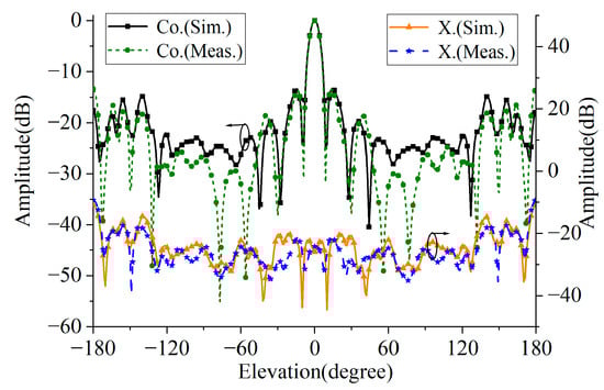 For verification, one broadband circularly polarized FRA prototype of 144 elements was designed based on the above architecture of the CPFRA for the satellite communication application in the millimeter-wave band. The FRA consists of 144 elements with an aperture area of 40.6 × 40.6π mm2 (12.3πλ02). A linearly polarized pyramid horn with an aperture of 14 × 20 mm2 and a height of 17 mm is adopted as the feeding source, which is installed on the center. In order to take into account a better aperture efficiency, the distance between the primary reflector surface and the sub-reflector surface is 32.5 mm, which corresponds to a focal length (F) of 65 mm. The simulated −10 dB beam-width of the horn radiation pattern is 64°. Once the layout of the CPFRA is ready, the phase compensation of each element on the primary reflector surface can be determined accordingly.