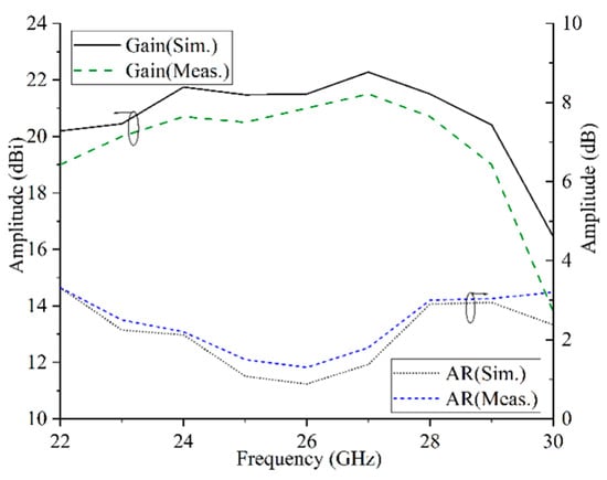 The proposed CPFRA is measured in a microwave anechoic chamber. The reflection characteristics of the antenna are measured by using a vector network analyzer (VNA). In addition, a coaxial-to-waveguide adaptor also needs to connect the test system and the feed horn. Figure 12 shows the measured normalized radiation patterns of the CPFRA at 26 GHz. It can be seen from the figure that the radiation pattern is consistent, the sidelobe is less than −13 dB, and the cross polarization is less than −15 dB. The curves of gain and aperture efficiency varying with frequency are shown in Figure 13. The difference between the simulation and test results mainly lies in the machining error and assembly errors. The FRA achieves a maximum gain of 21.2 dBi and an aperture efficiency of 27.2% at 26 GHz. In addition, the 3 dB gain bandwidth of the proposed FRA is 27.4% (22–29 GHz), and the 3 dB axial ratio (AR) bandwidth is 34%.