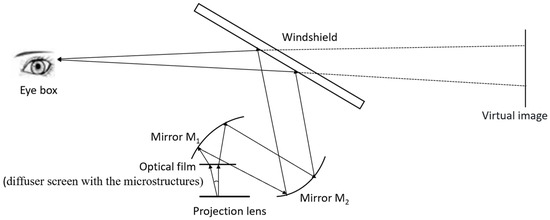 An HUD optical system based on a digital micro-mirror device (DMD) usually includes a projection lens, two mirrors, a diffuser screen, and a windshield [10,11], as shown in Figure 1. The mirrors are free-form surfaces designed to match the windshield curvature, folding the optical path and reducing the HUD volume. The image emitted by the projection lens is first formed on a diffusion screen. The formed image is then reflected by the mirrors and the windshield to reach the viewer’s eyes, creating a virtual image in front of the vehicle.