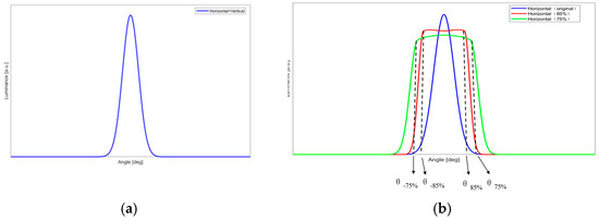 In this paper, the required horizontal and vertical viewing angles serve as the design specifications. However, their influence on luminance must also be considered. It is reasonable that as the viewing angle increases, the maximum luminance decreases. As shown in Figure 2b, the blue curve represents the original horizontal viewing angle curve; the red curve represents the viewing angle curve with 85% of the maximum brightness as the threshold; and the green curve represents the viewing angle curve with 75% of the maximum brightness as the threshold. The angles θ−85% and θ85% are smaller than θ−75% and θ75% and larger than the original. Simultaneously, the maximum luminance of θ85% is larger than θ75% and smaller than the original. In the design example proposed in this paper, the maximum luminance reaches 85% of the original maximum luminance after widening the viewing angle.