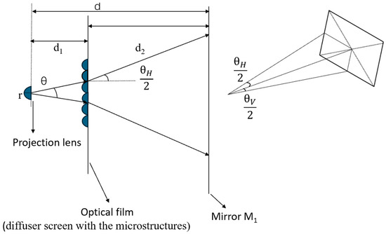 Figure 3 illustrates the design parameters of the microstructures, where r is the radius of the projection lens; d1 is the distance from the projection lens to the optical film; d2 is the distance from the optical film to mirror M1; and d is the total distance from the projection lens to mirror M1, so d = d1 + d2. Set θ as the viewing angle for the rays emitted by the original projection lens and θH and θV as the required horizontal and vertical viewing angles, respectively, after the rays pass through the optical film.