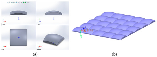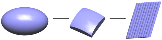 Considering that the major and minor axes of an ellipsoid on a single entity can have different curvatures, the original microstructure morphology is set as an ellipsoid, which allows for different control along the major and minor axes, thereby enabling independent regulation of the horizontal and vertical viewing angles. In addition, the ellipsoid must be cut into a rectangle with length DH and width DV to array the microstructures, as shown in Figure 4. The following section will explain in detail how to design the curvatures of the ellipsoid’s major and minor axes.