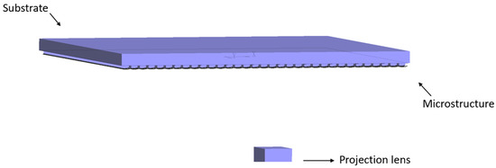 Based on the calculated parameters, the simulation model was established in the optical simulation design software LightTools 8.4, as shown in Figure 7. The model includes an optical film consisting of a substrate and microstructures, a projection lens, and a receiving surface. The radius of the projection lens is set as r = 8 mm; the distance from the projection lens to the optical film is 60 mm; the distance from the optical film to the receiving surface is 400 mm; and the thickness of the optical film is 0.2 mm.
