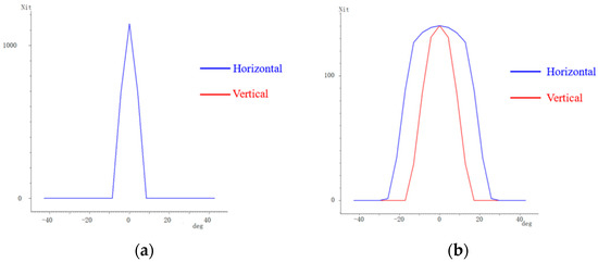 The simulation results with and without the optical film are illustrated in Figure 8. Without the optical film, the horizontal and vertical viewing angle curves are completely identical, as shown in Figure 8a. The angle for both at 85% of the maximum luminance is 2°. With the optical film, the horizontal and vertical viewing angle curves becomes distinct. The angles at 85% of the maximum luminance on the horizontal and vertical viewing angle curves are 20° and 8°, respectively.