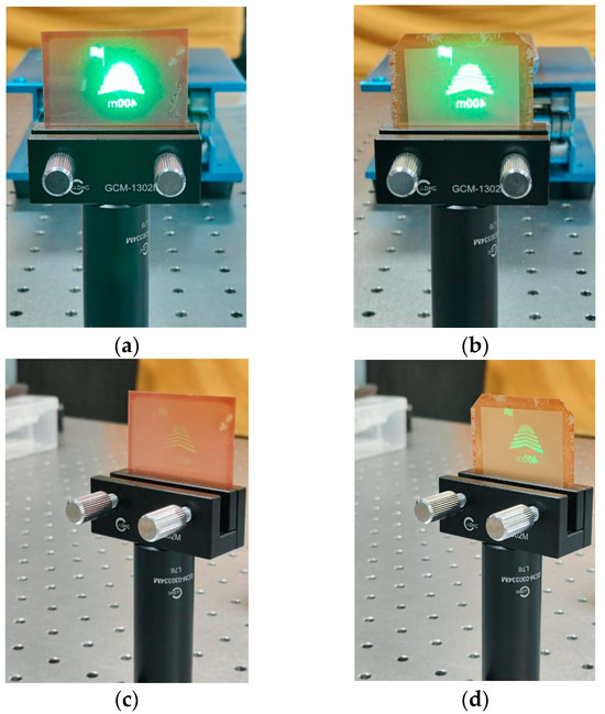 Figure 12 shows the image effects under varying conditions, with the projection lens’ luminous intensity and its distance to the diffuser screen fixed, while only the diffuser screen type and shooting position change. When comparing Figure 12a with Figure 12b, the image quality of the diffuser film with the microstructures shows no significant degradation compared to that without microstructures. The same conclusion can be drawn from comparing Figure 12c,d. Analysis of Figure 12c,d reveals that the brightness at wide viewing angles is significantly higher for the diffuser film with microstructures than for the one without.