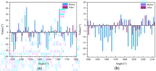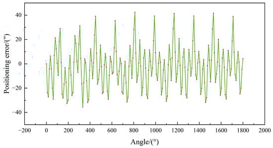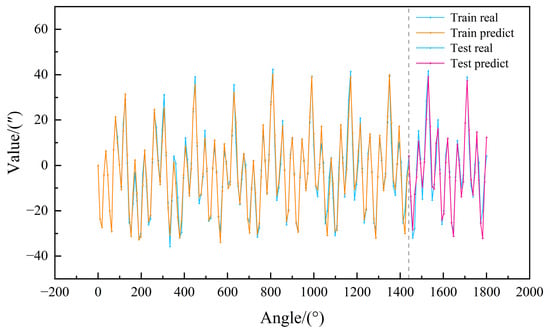 - Comparison of the effect before and after model prediction and compensation as shown in Table 4, after the model prediction and compensation of localization error, the localization accuracy is significantly improved, and the range of localization error on the test set (9° interval) is reduced from [−31.83″, 41.59″] to [−15.09″, 12.07″], and the standard deviation is reduced from 17.16″ to 4.95″, which is a decrease of 71.2%; Meanwhile, the range of turntable positioning error on the extrapolated test set (10° interval) is reduced from [−22.50″, 9.15″] to [−8.15″, 8.56″], and the standard deviation is reduced from 9.44″ to 3.68″, with a reduction of 61.0%, which proves the validity and reasonableness of the predictive compensation of turntable positioning error.