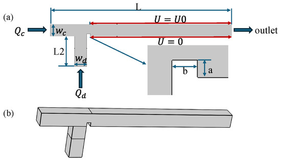 The geometric configuration of the ribbed T-junction microchannel is illustrated in Figure 1. As shown in Figure 1, ribs have been added downstream of the T-junction microchannel. Compared to traditional T-junction microchannel, the rib structure can enhance the shear effect on dispersed-phase fluids, thereby expanding the range of droplet formation and increasing the frequency of droplet formation. Electrodes are positioned on the upper wall of the main channel and connected to a high-voltage power supply, while corresponding electrodes on the lower wall are grounded. A potential difference is generated between these electrodes, enabling active control of microdroplet formation. A rectangular rib with the width of b and height of a is placed at the junction of the two channels to achieve passive control of microdroplet formation. The wall boundary condition is set as a non-slip wetted wall. The channel thickness is set to 100 m. The continuous phase (CP) enters from the main channel inlet, while the dispersed phase (DP) enters from the side channel inlet. The outlet pressure is set to 0 Pa. The fluid parameters chosen for the simulation are referenced from the study conducted by Liu et al. [43]. Detailed channel parameters and physical properties of the two phases are listed in Table 1. Generally, the microchannel droplet formation process is influenced by parameters such as the surface tension coefficient , dynamic viscosities of the dispersed and continuous phases and , flow rates of two phases and , as well as the effects of electric fields when applied. The dimensionless forms of these parameters are as follows: , , , .