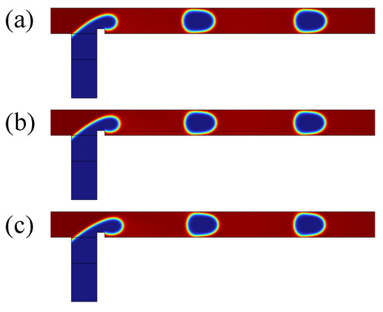 As shown in Figure 10a, for the case of rib height , the rib induces minor elevation of the dispersed phase, partially obstructing the continuous-phase flow. Downstream transport of the dispersed phase is accompanied by electric field-driven vertical (y-axis) stretching. Proximity to the lower wall initiates dispersed-phase adhesion, followed by upper wall attachment to form a fully pinning flow regime, culminating in complete channel occlusion. When the rib height , as shown in Figure 10b, increased rib height elevates the dispersed phase, narrowing the upper channel cross-section and significantly impeding continuous-phase flow. Electric field forces drive dispersed-phase adhesion to the lower wall exclusively, establishing a partially pinning flow regime. For the rib height in Figure 10c, the rib elevation positions the dispersed phase near the upper wall without adhesion, maintaining an unobstructed flow path. Throughout the pre-pinch-off phase, the dispersed phase remains non-adherent to channel walls, sustaining an unpinning flow regime. Moreover, it can be obtained that, the higher the rib, the smaller the droplet size formed.