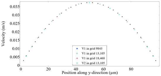 Grid independence study with and . and represent the velocity along the y-direction at m and m, respectively.