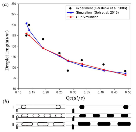 (a) Comparison of the droplet length from the experiment [20] and simulation [46] at under different ; (b) visualization of droplet formation from experiments [20] (left) and our simulations (right) under (I) , ; (II) , ; (III) , .