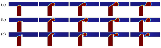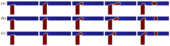 Understanding microdroplet morphology is of great significance for elucidating its formation mechanism. Firstly, the flow regimes of a discrete phase in a ribbed T-junction microchannel under an electric field are investigated. Figure 6 illustrates the effect of different electric fields on the dispersed-phase flow pattern in a ribbed T-junction microchannel under capillary number and flow ratio . By systematically increasing the electric capillary number , we examined the dispersed-phase behavior while maintaining a constant rib height. Since the electric field is applied downstream of the ribs, the initial motion of the dispersed phase entering the main channel remains unaffected by the electric field, as demonstrated by comparing three different cases (, 0.38, and 1.14). Upon entering the main channel from the side channel, the dispersed phase accumulates upstream of the rib due to flow obstruction. This accumulation process causes the dispersed phase to detach from the wall after passing over the rib and ceases to adhere to the channel wall. As shown in Figure 6a, for the case, the dispersed phase detaches from the wall after crossing the rib, forming an unpinning flow pattern. As it moves downstream, necking and rupture occur, resulting in droplet formation. In Figure 6b,c, after the electric field is applied, the dispersed phase is stretched in the y-direction. As shown in Figure 6b, for the case, after crossing the rib, the dispersed phase gradually deforms under the electric field and moves downstream while remaining attached to the bottom wall of the channel, forming a partially pinning flow. The resistance of the wall slows the downstream motion of the dispersed phase. As shown in Figure 6c, for , the dispersed phase experiences a stronger electric field force. After passing over the rib, the dispersed phase completely blocks the entire channel under the influence of the electric field and attaches to both the upper and lower walls of the main channel, forming a fully pinning flow pattern. As can be seen from Figure 7, the isosurface of the discrete phase volume fraction under three different clearly reveals three distinct flow patterns: unpinning, partially pinning, and fully pinning.