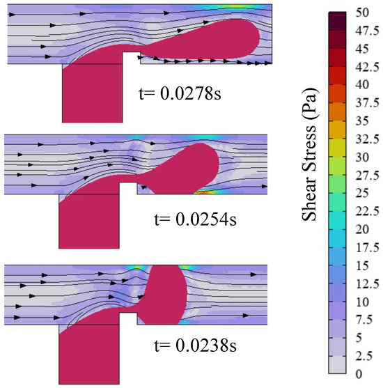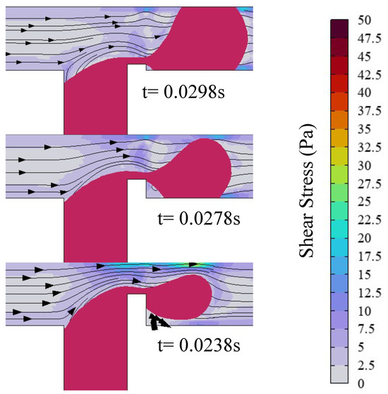 Shear stress and streamline distribution in the microchannel, with the red line representing the isosurface of the dispersed-phase volume fraction (), where , , , and . (up), (middle), and (down).