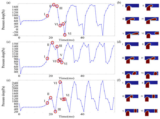 Figure 13 presents the temporal evolution of mid-channel pressure drop with variations . When the rib height ratio , the pressure drop attains its first peak (82 Pa) at t = 23 ms, corresponding to State II in Figure 13b, where the dispersed phase traverses downstream post-rib passage. The droplet formation cycle measures 16 ms, with consistent dispersed-phase morphology between cycle boundaries (States I–VI). At the rib height ratio , the peak pressure drop rises to 142 Pa at t = 22 ms, aligned with State II in Figure 13d, marking the dispersed phase’s passage over the rib apex. The formation cycle shortens to 11 ms. For the case of rib height ratio , the maximum pressure drop surges to 250 Pa at t = 21 ms, corresponding to State II in Figure 13e during rib traversal. The cycle minimizes to 8 ms, representing a reduction compared to that of . Under constant flow rates and electric field strength, elevated rib heights accelerate droplet formation kinetics, enabling high-frequency generation of smaller droplets in ribbed T-junction microchannels.