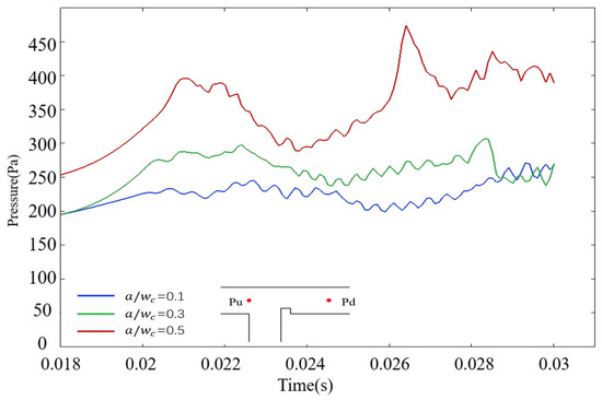 Subsequently, rib-induced modifications to droplet dynamics are analyzed via pressure field measurements in a ribbed T-junction microchannel under an electric field. During the filling stage, the dispersed phase enters the main channel and accumulates at the rib’s top end, leading to a progressive rise in upstream pressure. As the rib height ratio increases, the maximum upstream pressure escalates correspondingly. As shown in Figure 12, during the filling stage, when the rib height ratio , the maximum pressure within the T-junction microchannel during the filling stage measures 226 Pa. When the rib height ratio increases to , the peak pressure rises to 288 Pa, reflecting a increase compared to that of . For , the maximum pressure surges to 396 Pa, marking a increase relative to the baseline case (). These results underscore a strong positive correlation between rib height ratio and upstream pressure magnitude during the filling stage.