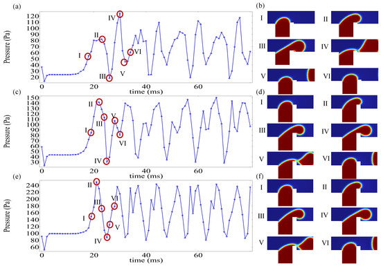 Figure 9 demonstrates the temporal evolution of channel pressure drop under varying alongside corresponding flow-state snapshots at critical stages. The periodic generation of droplets induces cyclical pressure drop accumulation and release within the microchannel, reflecting two distinct stages of droplet formation. The rise in pressure drop indicates the filling stage, where the dispersed phase enters the main channel from the side channel, obstructing continuous phase flow. This obstruction enhances the driving force, ultimately leading to droplet formation via neck breakup of the dispersed phase. The pressure drop describes the squeezing stage, where the continuous phase displaces the dispersed phase downstream, promoting droplet pinch-off at the neck region. Concurrently, the pressure drop gradually diminishes as the dispersed phase advances. Stages I–II in Figure 9b,d,f correspond to the filling stage of the dispersed phase. With increasing , the duration of this stage decreases from 4 ms to 3 ms, and further to 2 ms, indicating accelerated electric field-driven dispersion of the phase into the main channel. Consequently, higher voltages shorten filling-stage times. The pressure drop cycle, defined as the time interval between consecutive peaks in Figure 9a,c,e, provides a proxy for droplet production frequency. The calculated cycles measure 12 ms, 10 ms, and 9 ms for low, moderate, and high , respectively. It can be seen that, in T-junction microchannels without an electric field, the time required for droplet formation is the longest. After increasing the electric field, the droplet formation time is shortened, and, as the potential increases, the droplet formation time is shortened. After adding an electric field, the model is compared with passive T-junction mode, which can effectively shorten the droplet formation time and accelerate the droplet generation frequency.