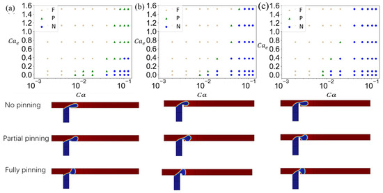 Figure 14b shows the dispersed-phase flow state diagram in a T-junction microchannel with a rib height ratio of . Compared to , the unpinning regime occupies a significantly expanded parametric domain. Notably, at and , the unpinning regime emerges, underscoring the dominance of hydrodynamic effects over electric field forces. This suggests that elevated rib heights and increased Ca synergistically amplify continuous-phase shear effects on the dispersed phase. A comparative analysis of Figure 14a,b reveals that increasing reduces the parametric domain of the partially pinning regime. The partially pinning regime, initially observed at high Ca and , fully transitions to the unpinning regime. This transition arises because the elevated rib lifts the dispersed phase, increasing its separation from the lower channel wall and thereby suppressing adhesion. At in Figure 14c, the dispersed-phase flow regime diagram demonstrates near-complete suppression of partially pinning states. While all three regimes persist, the partially pinned regime occupies a minimal parametric domain. At low Ca, reduced continuous-phase flow rates allow substantial dispersed-phase accumulation prior to necking, sustaining fully pinning regime dominance. As Ca increases, partially pinning domains convert into unpinning regimes. At high capillary numbers, the unpinning regime becomes ubiquitous. This is because the high elevates the dispersed phase, and also increasing continuous-phase shear force further inhibits adhesion.