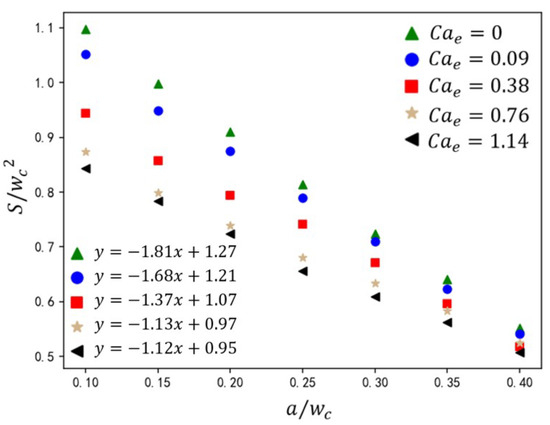 The effect of rib height ratio on droplet size under different electric capillary numbers. The straight-line equation in the lower-left corner represents the fitting formula for the calculated data under different electric capillary numbers, where y represents the droplet size and x represents the rib height ratio .