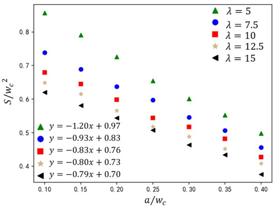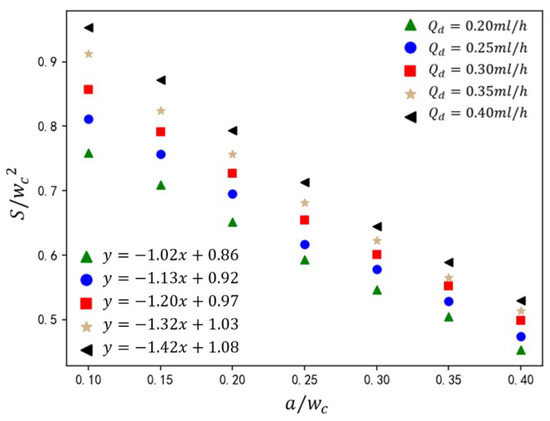 The velocity of the dispersed phase governs its volumetric occupancy within the main channel, directly influencing droplet size. As shown in Figure 16, under fixed dimensionless parameters (, ), the normalized droplet size is presented for rib height ratios and dispersed-phase flow rates . Increasing dispersed-phase velocity elevates its volumetric influx into the main channel, augmenting neck thickness during droplet formation. This delays neck contraction, resulting in larger droplet sizes. At the constant value of , droplet size exhibits a linear inverse relationship with . Higher ribs amplify shear thinning, accelerating neck rupture and reducing . From the analysis of Figure 16, it can be observed that empirical analysis of the five cases yields the correlation
