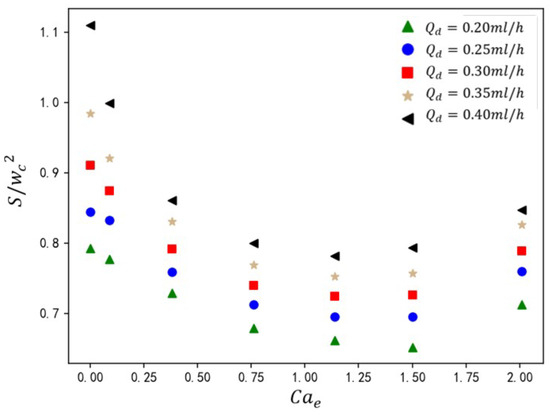 where S is the area of dispersed phase, the width of the main channel inlet, a the rib height, and and the linear fitting parameters. Increasing amplifies the slope of the linear fit while reducing the intercept , reflecting the reduction in stronger shear-driven droplet size. As shown in Figure 15, regardless of the height ratio of the ribs, the droplet size formed in the T-junction microchannel with the addition of an electric field is relatively smaller compared to the passive T-junction mode. For example, when the rib height ratio is 0.1 and there is no electric field, the effective size of the formed droplet is close to 1.1. When = 1.14, the effective size of the formed droplet is 0.85. However, this -dependent sensitivity diminishes with increasing rib height ratio . At a low regime, weak continuous-phase shear allows electric field forces to dominate. Rising triggers morphology transitions from an unpinning to fully pinning state, accelerating necking dynamics and reducing droplet size. At a high rib height regime, rib-induced elevation displaces the dispersed phase from channel walls, suppressing adhesion. Continuous-phase flow acceleration dominates, sustaining unpinning flow regardless of . Consequently, exerts minimal influence on droplet generation.