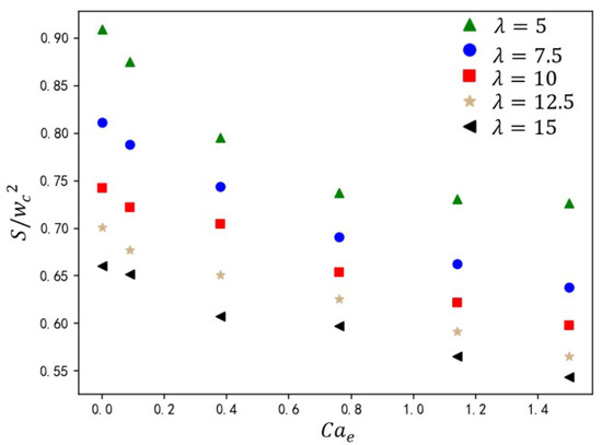 Droplet size is one of the key aspects of droplet generation in T-junction microchannels. In this section, the effects of the electric capillary number (), rib height ratio (), dispersed-phase flow rate , and two-phase viscosity ratio on droplet size are studied. As shown in Figure 15, under inlet flow rate ratio and capillary number , the variation in droplet size is shown for rib height ratios () and electric capillary numbers (). The data demonstrate that increasing synergistically amplifies the shear stress exerted by the continuous phase on the dispersed phase, driving a monotonic reduction in normalized droplet size. This trend adheres to the linear scaling law: