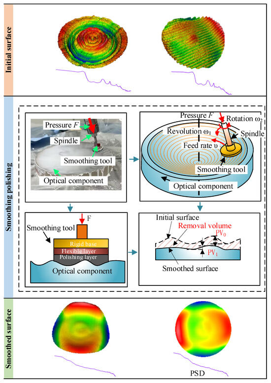 Principle of smoothing polishing. Note that: Top: Examples of circular and stripe-like MSF structures on optical surfaces and their corresponding PSD curves. Middle: Illustration of the smoothing process using a dual-rotating tool. Bottom: Smoothed surfaces.