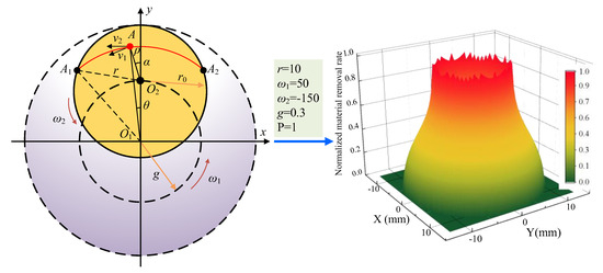 where g denotes the eccentricity, representing the revolution radius; r0 is the radius of the smoothing tool; ω1 and ω2 are the angular velocities of the revolution and rotation motions, respectively. The total effective coverage radius of the tool’s removal function is therefore g + r0.