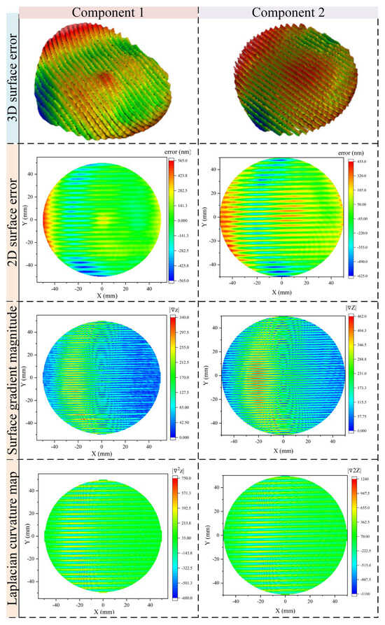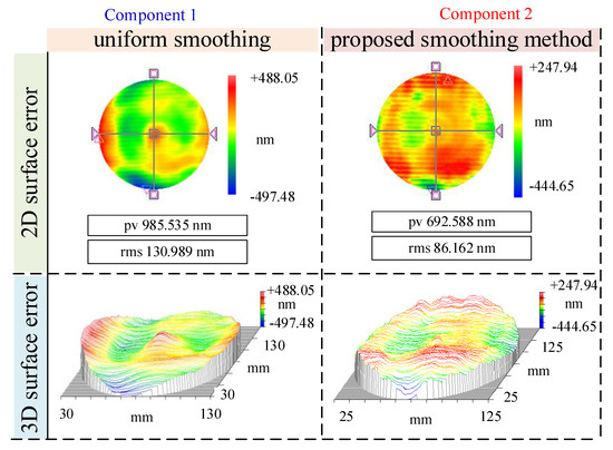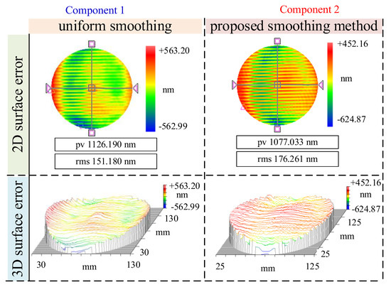 As shown in Figure 7 and Figure 8, both Component 1 and Component 2 initially exhibited prominent surface irregularities, primarily characterized by periodic ripples and band-like structures—typical signatures of MSF errors introduced during prior milling or pre-polishing operations. These errors were particularly evident in the 2D surface maps and further emphasized in the 3D topographies, which revealed ridge-valley alternations aligned along specific directions. Such features can significantly deteriorate optical performance by inducing stray light and scattering effects. After applying the conventional uniform smoothing method, some degree of surface improvement was achieved, as evidenced by the slight reduction in PV and RMS values. However, residual errors remained spatially nonuniform, and the characteristic ripple patterns persisted to a considerable extent. This highlights the limited capability of uniform smoothing in addressing structured or directionally biased error distributions, as it lacks the spatial adaptiveness required to selectively suppress high-gradient or high-curvature regions. In contrast, the proposed morphology gradient-aware spatiotemporal coupled smoothing method resulted in a marked transformation of the surface morphology. The periodic ripples were significantly attenuated, and the remaining residuals appeared more randomly distributed and isotropic. The 3D plots illustrate smoother, more uniform surfaces with diminished slope transitions and a clear suppression of directional error trends. This demonstrates the proposed model’s effectiveness in identifying and prioritizing regions requiring greater smoothing emphasis, particularly in areas with pronounced gradient or curvature features.