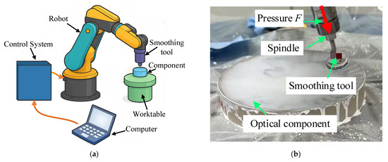 Experimental setup of the smoothing polishing process. (a) schematic diagram of the robotic smoothing system; (b) actual experimental scene.