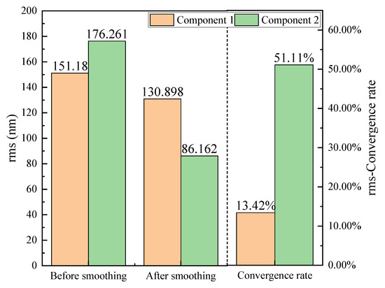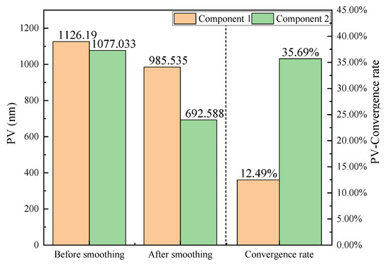 To directly compare the baseline method and the proposed strategy. Figure 9 and Figure 10 present a comparative analysis of the PV and RMS metrics before and after smoothing, offering a quantitative assessment of the error suppression capabilities of the two approaches. For Component 1, which underwent traditional uniform smoothing, the PV value showed a modest reduction from 1126.19 nm to 985.54 nm, corresponding to a convergence rate of 12.49%. Similarly, the RMS value decreased by only 13.42%. In stark contrast, Component 2—processed using the proposed method—demonstrated significantly greater improvements. The PV dropped from 1077.03 nm to 692.59 nm, representing a convergence rate of 35.69%, while the RMS decreased sharply from 176.26 nm to 86.16 nm, yielding a convergence rate of 51.11%. These metrics indicate a much higher material removal selectivity and precision when the dwell time is adaptively modulated based on surface gradient and curvature descriptors. This validates the superiority of the proposed method over the baseline in terms of convergence performance for both PV and RMS error metrics.