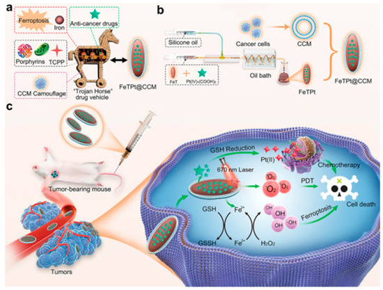 Schematic of FeTPt@CCM synthesis and its combined therapeutic functions. (a) Design of the bioinspired “Trojan Horse” nanocarrier. (b) FeTPt prepared via microfluidics and coated with cancer cell membrane (CCM). (c) After injection, FeTPt@CCM accumulates in tumors, where Pt(IV) is reduced to Pt(II) for chemotherapy, Fe3+ induces ferroptosis via GSH/H2O2 reactions, and TCPP generates 1O2 under 670 nm light for PDT. This system enables synergistic chemo-, ferroptosis, and photodynamic therapy. Copyright 2023 Advanced Science [48].