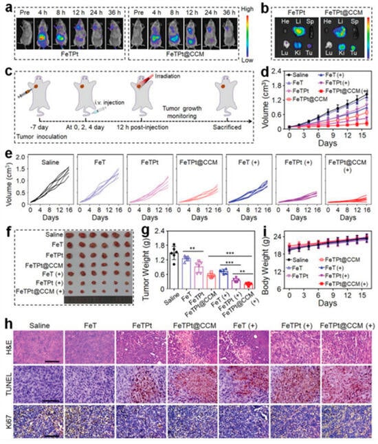 Evaluation of the in vivo anticancer efficacy of FeTPt@CCM. (a,b) Fluorescence imaging of tumor-bearing mice and excised organs/tumors following intravenous injection of FeTPt or FeTPt@CCM. (c) Overview of treatment schedule. (d,e) Tumor growth curves under various treatments. (f,g) Photographs and weights of tumors collected at study endpoint. (h) H&E, TUNEL, and Ki67 staining of tumor tissues (scale bar = 100 µm). (i) Body weight monitoring during treatment. Groups with (+) or without (−) irradiation; n = 6 per group. Data shown as mean ± SD; ** p < 0.01, *** p < 0.001 (“***” represents statistical significance). Copyright 2023 Advanced Science [48].