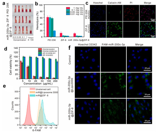 Assessment of cytotoxicity and uptake of miR-200c-3p@ZIF-8. (a,b) Hemolysis comparison of PEI 25K, ZIF-8, and miR-200c-3p@ZIF-8. (c) Live/dead staining of HUVEC cells after treatment. (d) Cell viability across concentrations of PEI 25K and ZIF-8. (e) Uptake analysis via flow cytometry. (f) Confocal imaging of CHON-001 cells treated with free and formulated miR-200c-3p. Copyright 2023 Frontiers [51].