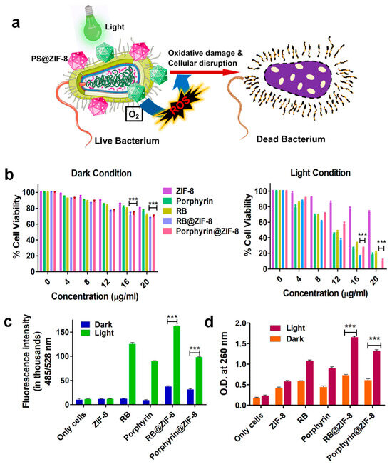 Antimicrobial activity of PS@ZIF-8. (a) Schematic showing microbial disruption by PS@ZIF-8. (b) Viability of E. coli after treatment with RB, porphyrin, ZIF-8, RB@ZIF-8, and porphyrin@ZIF-8 under dark and light conditions. (c) ROS generation assessed via DCFDA in treated and untreated cells under both lighting conditions. (d) Nucleic acid leakage from E. coli following probe exposure under dark and LED light (*** p < 0.001). Copyright 2025 ACS [58].