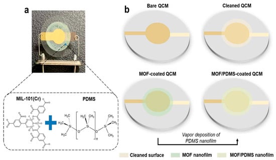 VOC sensors developed in this study. (a) Image of the QCM-based sensor coated with MOF/PDMS. (b) Schematic showing the fabrication process of the MOF/PDMS-coated sensor. Copyright 2024 ACS [87].