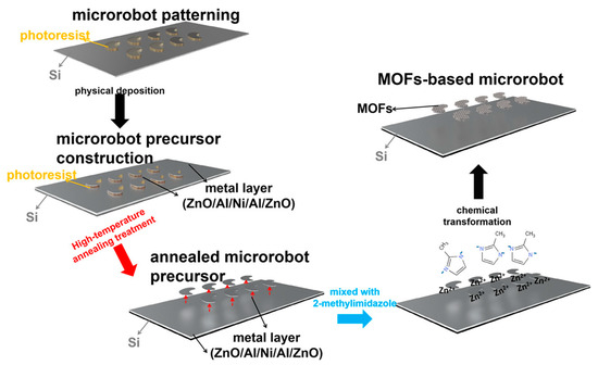 Diagram showing the process for creating MOF-integrated microrobots on silicon substrates. Copyright 2021 ACS [98].