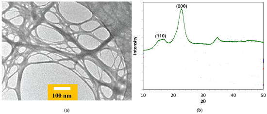 Figure 1a presents a TEM observation of cellulose nanofibrils. Their width is within the range of 5–6 nm. X-ray diffraction (XRD) analysis confirmed the crystalline structure of the TOCNFs (Figure 1b); the TOCNFs exhibit a weak peak at 14°, assigned to the [110] lattice plane, and a sharper peak at 22°, corresponding to the [200] lattice plane of cellulose [35].