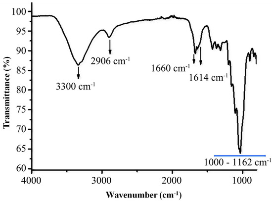 The FTIR spectrum of the TOCNFs, presented in Figure 2, displays distinct absorption bands of polysaccharides. An intense and broad band centered around 3300 cm−1 corresponds to O–H stretching vibrations, indicative of hydroxyl groups. Likewise, the band at 2906 cm−1 is assigned to the stretching vibration of the (C–H) bond.